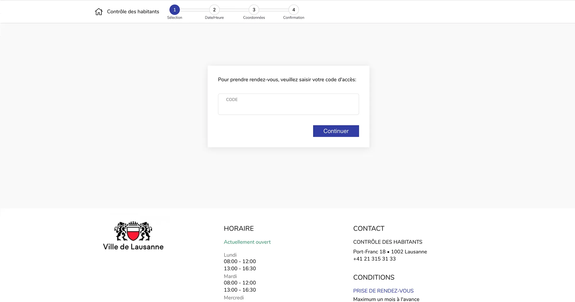 🎯 Online-Reservierungssystem mit Einberufungscode für die Einwohnerkontrolle, Stadt Lausanne.