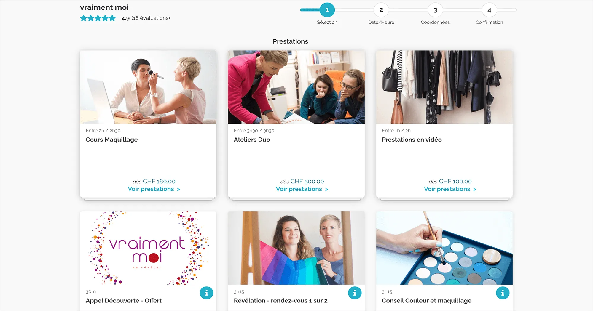 Vous conservez la maîtrise complète des paramètres de la réservation en ligne : présentation, disponibilités, services, durée et informations demandées.